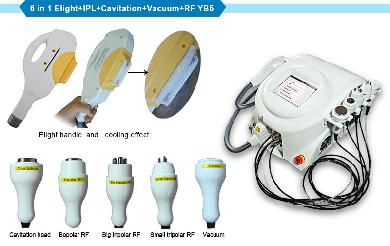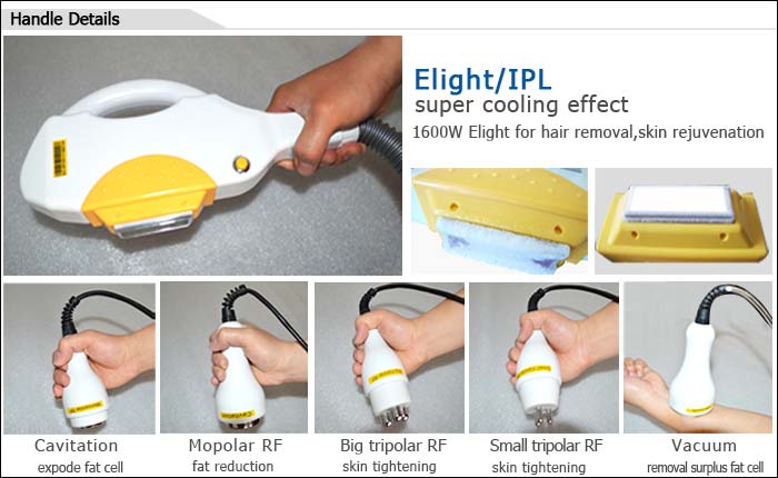 Maschine mit 6 Griffen: Elight-Griff, Kavitationsgriff, Vakuumgriff, großer tripolarer HF, kleiner tripolarer HF, monopolarer HF.