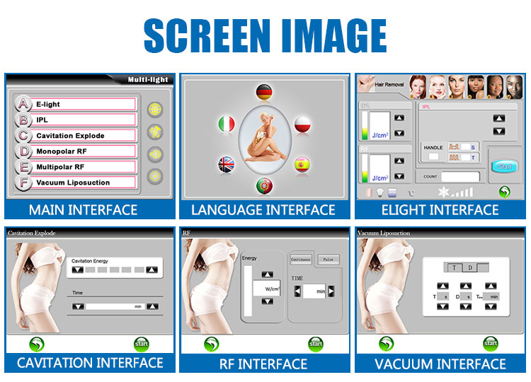 - Griff: ein elight Griff, Monopolar RF Kopf, Tripolar RF Kopf (groß), Tripolar RF Kopf (klein), Ultraschall Kavitationskopf, Vakuum Fettabsaugung Kopf