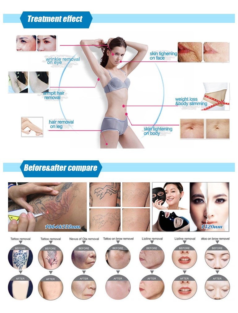 3) Nd-yag-Laser-Griff verwendet importierten Laser-Bar, Lebensdauer von 1 Million Aufnahmen. Es verfügt über 5 Behandlungsköpfe, einstellbar auf 1064 nm und 532 nm / fest bei 1064 nm und 532 nm und 1320 nm.